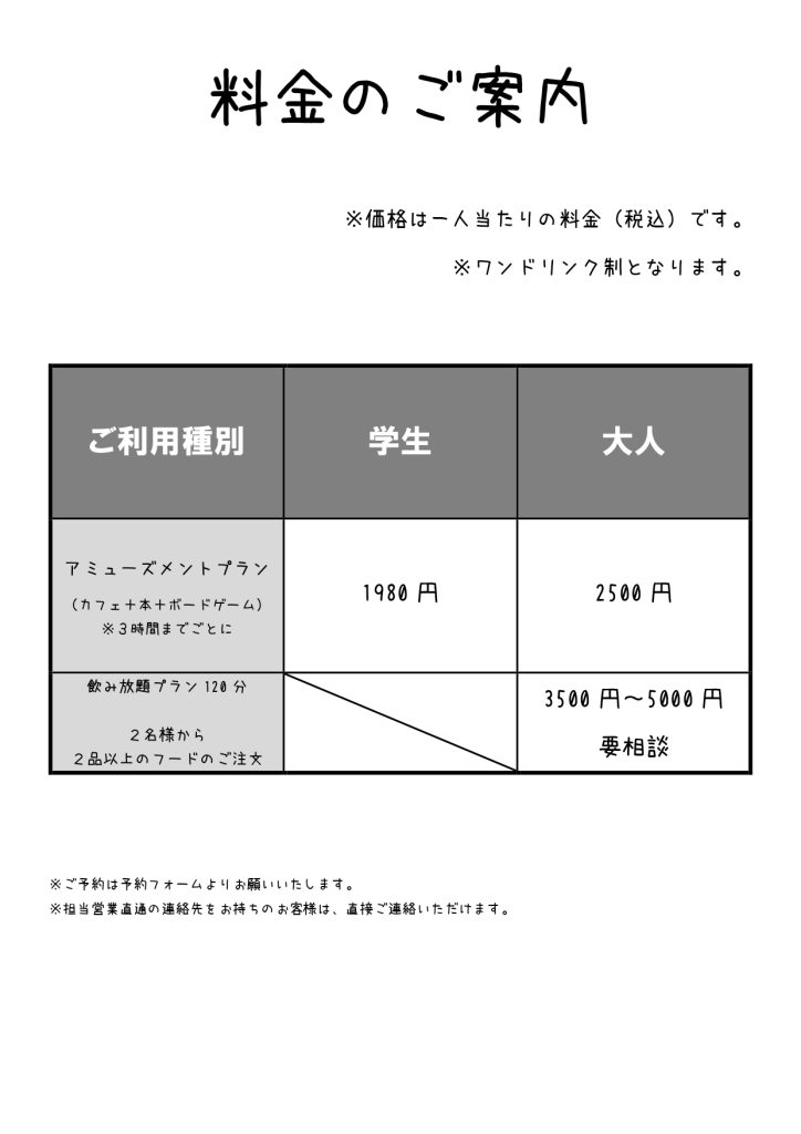 大箱ゲームやTRPGが遊べる大きなテーブル2つと、4人がけのテーブルをご用意しています。