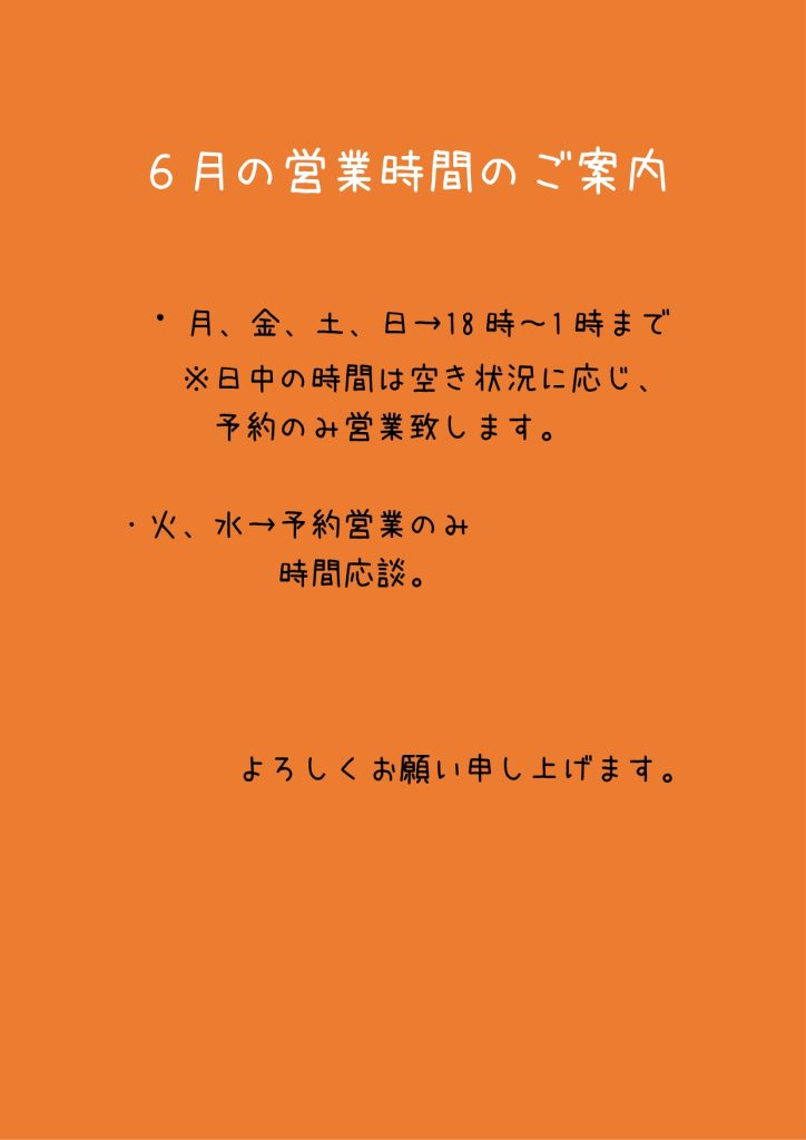 6月の営業日は基本的に月、金、土、日となります。営業時間は18時~1時です。※日中の時間帯は空き状況に応じ、予約のみ営業致します。ご相談ください。 6月は、火曜、水曜は予約のみ営業致します。(予約は2時間のご利用までとなります。) 6月18日... -