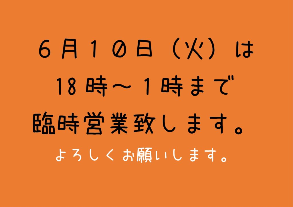 6/10(火)は18時から1時まで臨時営業致します。 -